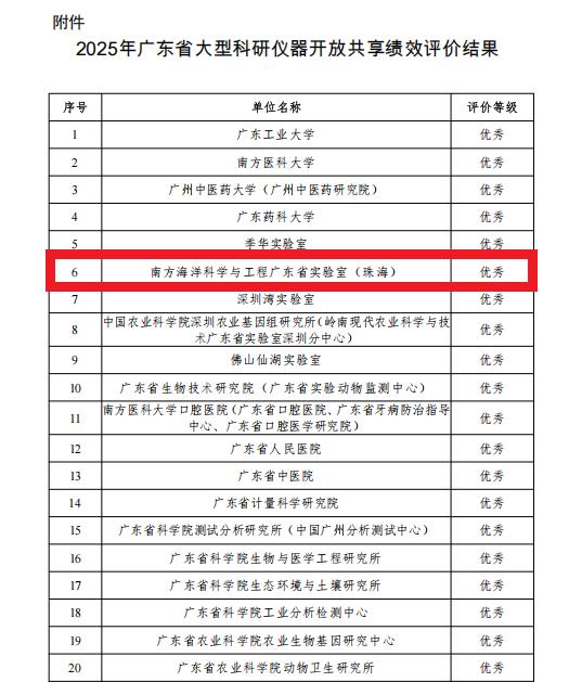 近日,广东省科学技术厅公布了2025年广东省大型科研仪器开放共享绩效评价结果,此次共有80家单位参加评价考核,我实验室荣获评价考核“优秀”等级。
