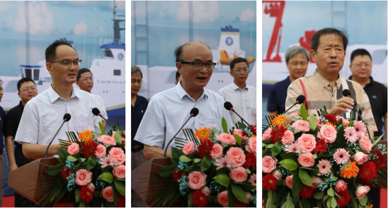 活动现场,江新船厂祝建华总经理、武汉船舶设计院黄俊执行董事和实验室副主任王辉研究员先后致辞。陈大可院士宣布“香洲云”下水并祝愿她从此以后一帆风顺。实验室公共事务部刘晓平女士行掷瓶礼。